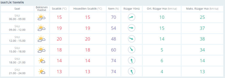 Akşam saatlerine doğru ise termometreler 18 derece olarak ölçülürken parçalı bulutlu gökyüzüyle birlikte gün batımı yaşanıyor. Akşam saatlerinde de az bulutlu gökyüzüyle birlikte termometreler 14 derece seviyelerinde ölçülüyor. Gece saatlerinde de az bulutlu gökyüzüyle birlikte termometreler 13 derece seviyelerine kadar geriliyor.