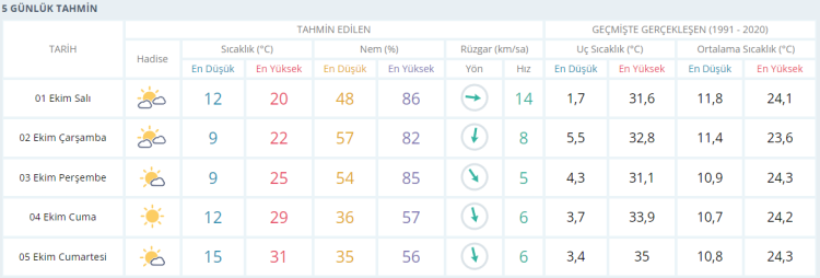 ÇARŞAMBA parçalı bulutlu ve güneşli 22 derece PERŞEMBE az bulutlu ve güneşli 25 derece CUMA açık ve güneşli 29 derece CUMARTESİ az bulutlu ve güneşli31 derece olacak.