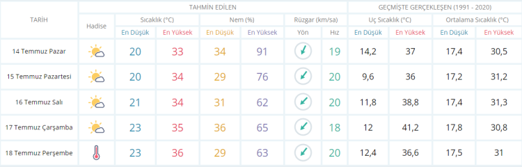 Meteoroloji Bursa için 14 Temmuz (Pazar) hava tahmin raporunu yayınladı. Bursa genelinde haftanın son günü sabah ve öğle saatlerinde güneşli ve açık bir hava etkili olurken öğleden sonra ve akşam saatlerinde ise sıcak hava ile birlikte az bulutlu gökyüzü de etkisini sürdürüyor. Öte yandan yeni hafta için yağış sonrası aşırı sıcak uyarısı ile birlikte termometrelerde sıcaklık 36 dereceye kadar yükseliyor. İşte Bursa için 5 günlük hava durumu detayları...