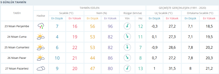 Önümüzdeki 5 gün boyunca sıcaklıkların ortalama 20 derece civarında seyretmesi tahmin ediliyor.