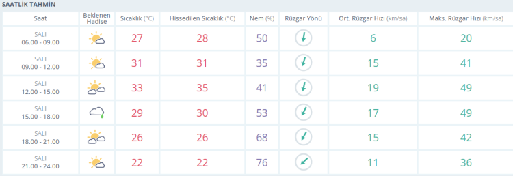 ÇARŞAMBA rüzgarlı ve 30 derece PERŞEMBE az bulutlu 31 derece CUMA az bulutlu 32 derece CUMARTESİ aşırı sıcak ve 35 derece olması bekleniyor.
