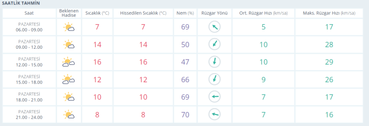 Akşam saatlerine doğru ise termometreler 12 derece olarak ölçülürken parçalı bulutlu gökyüzüyle birlikte gün batımı yaşanıyor. Akşamsaatlerinde de az bulutlu gökyüzüyle birlikte termometreler 10 derece seviyelerinde ölçülüyor. Gece saatlerinde de az bulutlu gökyüzüyle birlikte termometreler 8 derece seviyelerine kadar geriliyor.