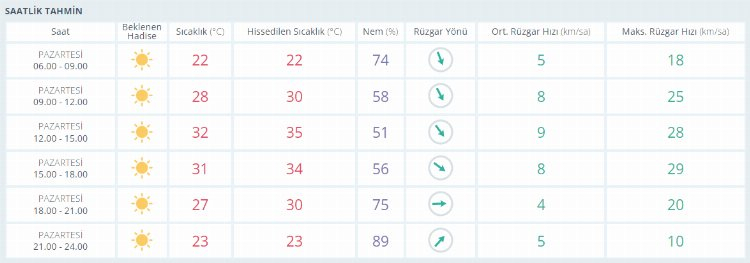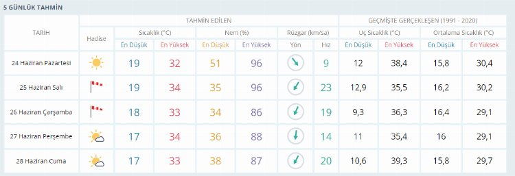 SALI rüzgarlı ve bol güneşli 34 derece ÇARŞAMBA rüzgarlı ve güneşli 33 derece PERŞEMBE az bulutlu ve bol güneşli 34 derece CUMA az bulutlu ve bol güneşli 34 derece olacak.