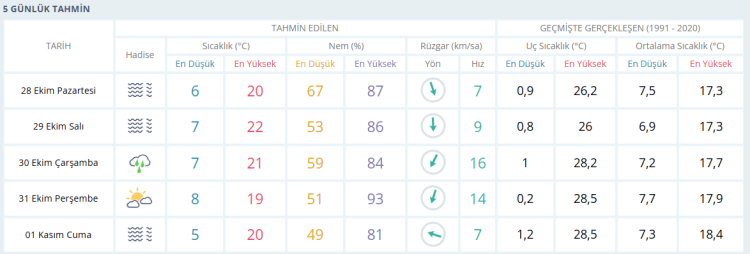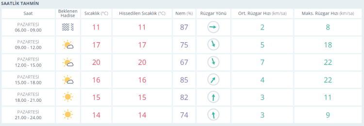 SALI puslu, parçalı bulutlu ve güneşli22 derece ÇARŞAMBA çok bulutlu ve sağanak yağışlı 21 derece PERŞEMBE parçalı bulutlu ve güneşli 22 derece CUMA puslu, bulutlu ve güneşli 20 derece olacak.