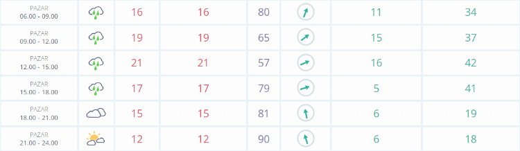 Rapora göre Bugün (PAZAR) şehir genelinde sabah ve öğle saatlerinde hava gün içinde kapalü ve yağmurlu olurken sıcaklıklar 14 dereceye kadar düşüşe geçiyor. Akşam saatlerinde ise sıcaklık etkisini azaltıyor. Öte yandan 5 günlük yeni hafta raporunda Bursa için kuvvetli sağanak uyarısi yapıldı.
