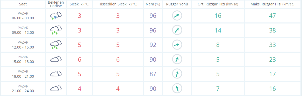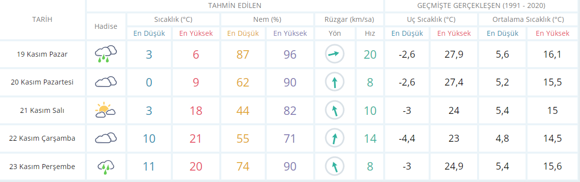 Rapora göre Bugün (PAZAR) şehir genelinde sabah ve öğle saatlerinde hava gün içinde kapalı ve yağmurlu olurken sıcaklıklar 6 dereceye kadar düşüşe geçiyor. Akşam saatlerinde ise sıcaklık etkisini azaltıyor. Öte yandan 5 günlük yeni hafta raporunda Bursa için sağanak uyarıs yapılırken sıcaklıklar 21 dereceye kadar yükseliyor.