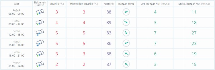 Rapora göre Bugün (PAZAR) şehir genelinde sabah ve öğle saatlerinde karla karışık yağmurlu bir hava etkili oluyor. Ayrıca sıcaklıklar gün içinde 5 dereceye kadar yükselirken akşam saatlerinde 3 dereceye kadar düşüş gösteriyor.