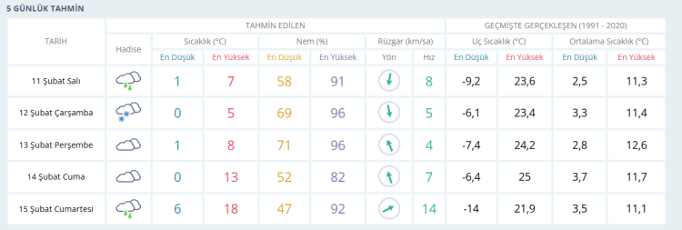 ÇARŞAMBA kar yağışlı 0 derece PERŞEMBE çok bulutlu 1 derece CUMA parçalı bulutlu 0 derece CUMARTESİ yağışlı 6 derece olacak.