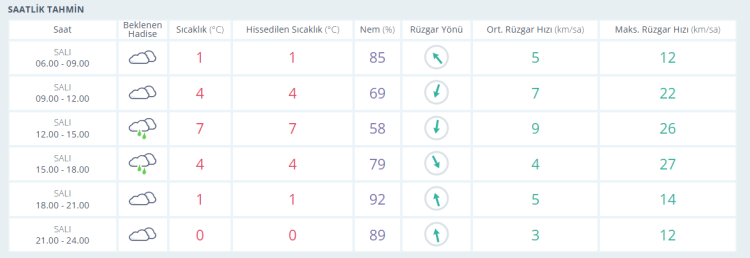 Akşam saatlerine doğru ise termometreler 4 derece olarak ölçülürken bölgesel yağış geçişleri ve çok bulutlu gökyüzüyle birlikte gün batımı yaşanıyor. Akşamsaatlerinde çok bulutlu gökyüzüyle birlikte termometreler 1 derece seviyelerinde ölçülüyor. Gece saatlerinde de çok bulutlu gökyüzüyle birlikte termometreler 0 derece seviyelerinde ölçülüyor.