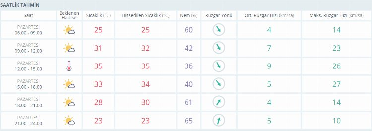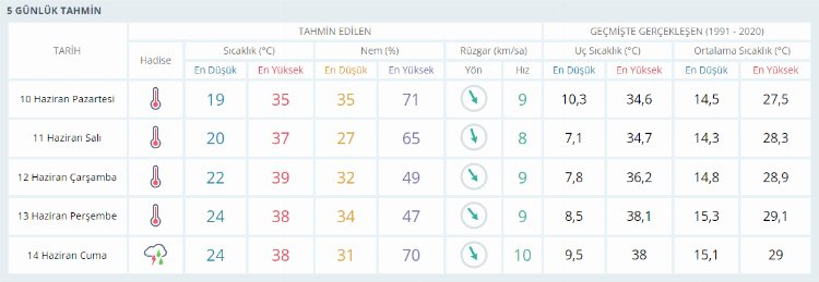 SALI bunaltıcı sıcak 35 derece ÇARŞAMBA bunaltıcı sıcak 39 derece PERŞEMBE bunaltıcı sıcak 38 derece CUMA gökgürültülü sağanak yağışlı 38 derece olacak.