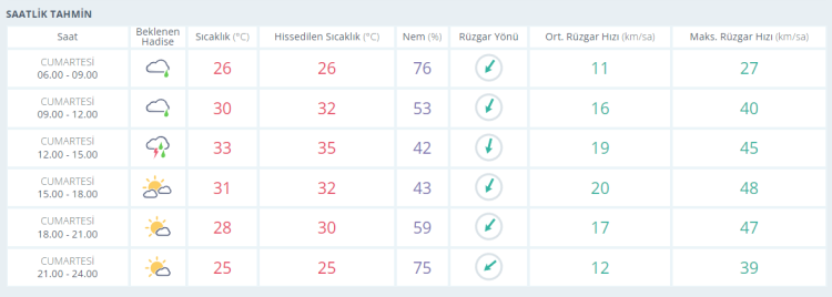 Akşam saatlerine doğru ise termometreler 31 derece olarak ölçülürken parçalı bulutlu ve güneşli gökyüzüyle birlikte gün batımı yaşanıyor. Akşam saatlerinde az bulutlu gökyüzüyle birlikte termometreler 28 derece seviyelerinde ölçülüyor. Gece saatlerinde de az bulutlu gökyüzüyle birlikte termometreler 25 derece seviyelerine kadar geriliyor.
