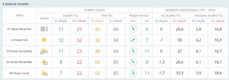 Haftanın son iş gününde ise (CUMA) sıcaklık sabah saatlerinde 7 derece seviyelerinde ölçülüyor. Gün içerisinde termometreler az bulutlu ve güneşli gökyüzüyle birlikte sıcaklık 22 derece seviyelerine kadar tırmanıyor.