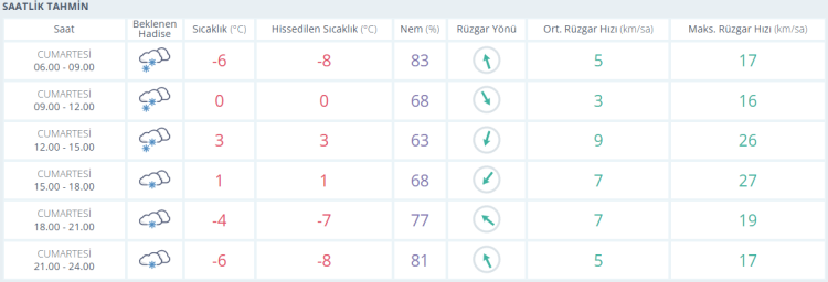 Gece saatlerinde de kar yağışı ve çok bulutlu gökyüzüyle birlikte termometreler -8 derece seviyelerinde ölçülüyor.