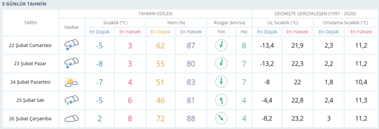 PAZAR kar yağışlı 3 derece PAZARTESİ parçalı bulutlu 4 derece SALI karla karışık yağmur ve 6 derece ÇARŞAMBA bulutlu ve 8 derece olması bekleniyor.