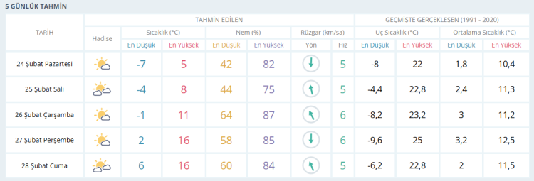 SALI parçalı bulutlu 8 derece ÇARŞAMBA parçalı bulutlu 11 derece PERŞEMBE güneşli16 derece CUMA parçalı bulutlu ve 16 derece olması bekleniyor.