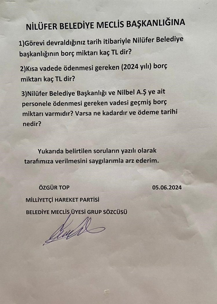 MHP’li Özgür Top’un verdiği önergede “Görevi devraldığınız tarih İtibariyle Nilüfer Belediye başkanlığının borç miktarı kaç liradır, kısa vadede ödenmesi gereken (2024 yılı) borç miktarı kaç liradır, Nilüfer Belediye Başkanlığı ve Nilbel A.Ş ye ait personele ödenmesi gereken vadesi geçmiş borç miktarı var mıdır, varsa ne kadardır ve ödeme tarihi nedir?” ifadeleri yer aldı.