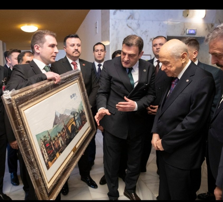 MHP Genel Başkanı Devlet Bahçeli'ye Bursa'nın simge yapılarının yer aldığı bir tablo hediye edildi.