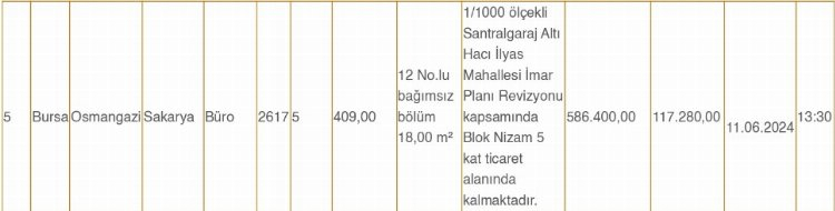 Satışa sunulan taşınmazların arasında büro, zeytinlik, çalılık ve tarlalar bulunuyor.