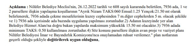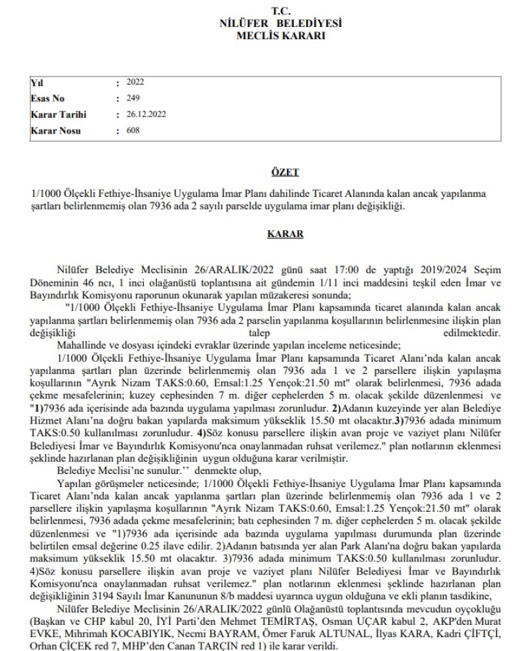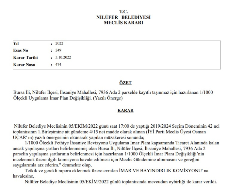 Söz konusu alan için hazırlanan 1/1000 ölçekli Fethiye–İhsaniye Revizyonu Uygulama İmar Planı, Nilüfer Belediye Meclisi’nin 26 Aralık 2022 tarihli kararıyla kabul edilmiş, ardından Bursa Büyükşehir Belediye Meclisi’nin 21 Şubat 2023 tarihli kararıyla değiştirilerek onaylanmıştı. Önceki planlarda hastane alanı olarak belirlenen taşınmazın daha sonra ticari iş merkezi kullanımına dönüştürüldüğü, plan değişikliğiyle yapılaşma yüksekliğinin 21,50 metreye çıkarılarak 7 kat olarak belirlendiği ifade edildi.