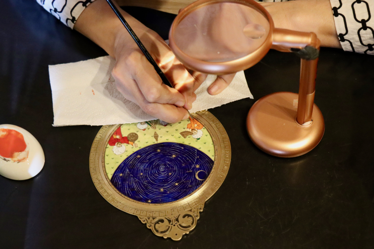 Usturlap ile farklı sanatları bir araya getirmek için yola çıkan usturlap sanatçısı Cebrail Çukurkaya'nın pirinçten yaptığı hucendi usturlabının ana gövdesi, minyatür sanatçısı Aylin Özkan'ın deri üzerine yaptığı minyatürle buluştu.