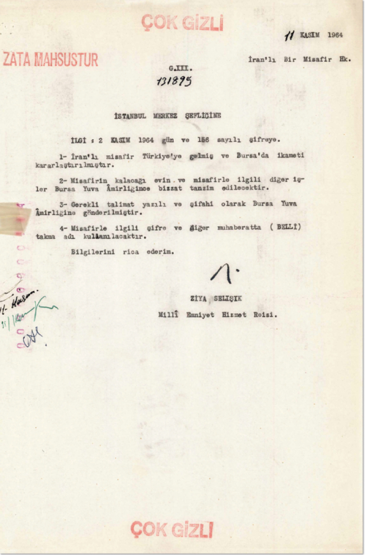 Söz konusu yazının, Milli Emniyet Hizmeti Reisi Ziya Selışık imzasıyla 11 Kasım 1964 tarihinde İstanbul Merkez Şefliği’ne “çok gizli” ibaresiyle gönderildiği belirtildi.