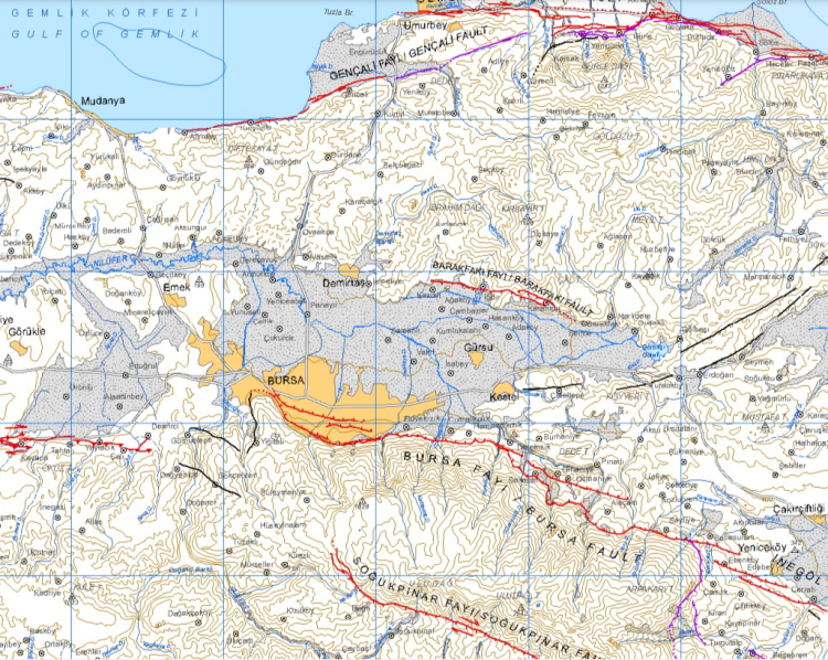 Maden Tetkik ve Arama Genel Müdürlüğü'nün (MTA) hazırladığı Diri Fay Hatları haritasına göre Bursa'daki diri fay hatlarından,