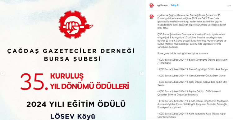 Çağdaş Gazeteciler Derneği Bursa Şubesi’nin 35. Kuruluş yıl dönümü ödülleri geçtiğimiz günlerde belli olmuştu.