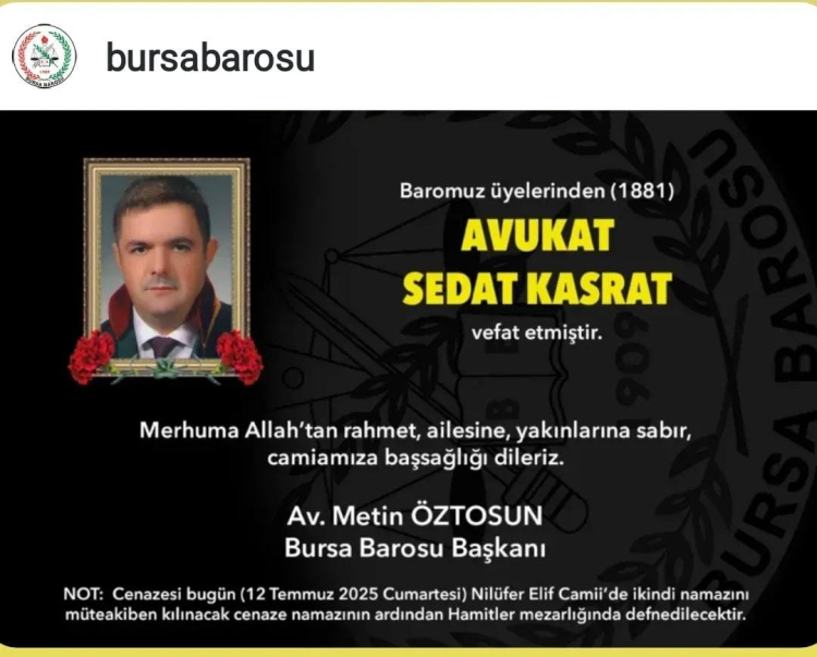 Bursa Barosu hayatını kaybeden avukatla ilgili bir taziye mesajı yayımladı.