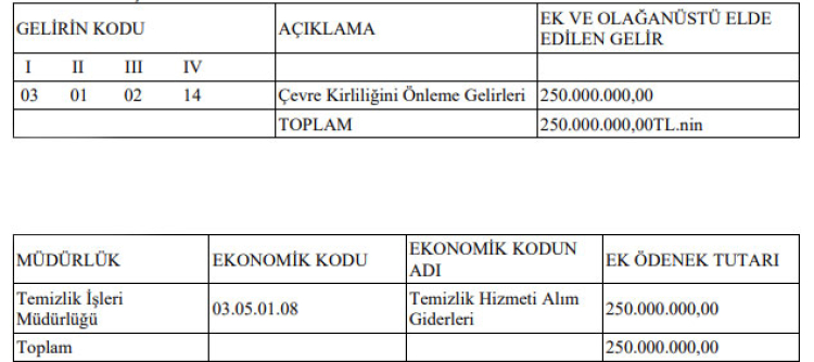 Söz konusu giderleri karşılamak amacıyla toplam 250 milyon TL tutarında ek ödenek ihtiyacı doğduğu ifade edildi.