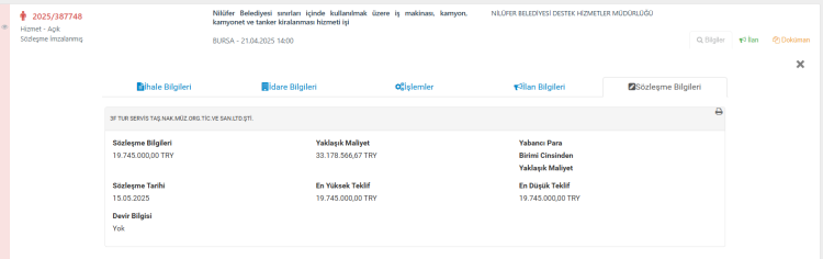 Nilüfer Belediyesi tarafından açılan, "Nilüfer Belediyesi sınırları içinde kullanılmak üzere iş makinası, kamyon, kamyonet ve tanker kiralanması hizmeti işi başlıklı ihale sonuçlandı.