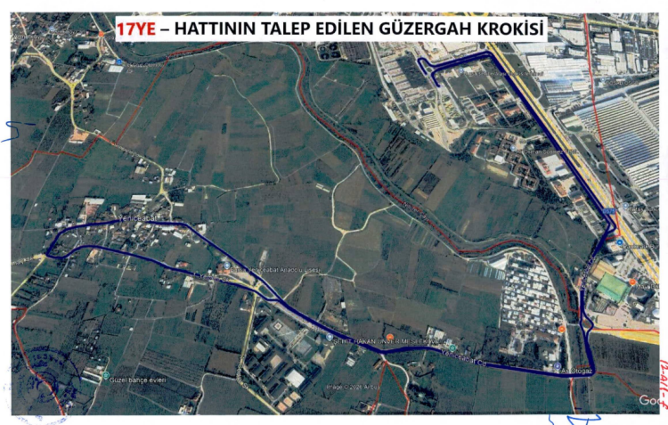 17/YE hattı, Bursa Şehirlerarası Otobüs Terminali çevresinde ring hattı olarak hizmet verecek. Hat güzergahı Bursa Şehirlerarası Otobüs Terminali’nden başlayarak İstanbul Yolu Caddesi, Yeniceabat Caddesi, 3. Yamaç Sokak ve 1. Yemeni Sokak üzerinden tekrar terminale dönecek.