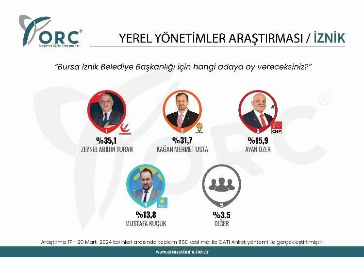 Yapılan anketlere göre İznik'te yüzde 35.1 ile Yeniden Refah'ın adayı Zeynel Abidin Turan yarışı önde tamamladı.