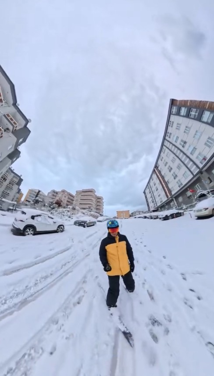 Nilüfer Belediyesi Temizlik İşleri Müdürlüğü personeli kar yağışını halay çekerek kutlarken, Mudanya ilçesinde bir kayaksever, sokakta kayak yapmanın keyfini çıkardı.