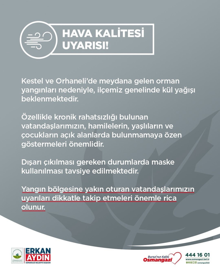 Osmangazi Belediyesi'nden yapılan açıklamada, "Kestel ve Orhaneli’de meydana gelen orman yangınları nedeniyle, ilçemiz genelinde kül yağışı beklenmektedir." ifadeleri kullanıldı.