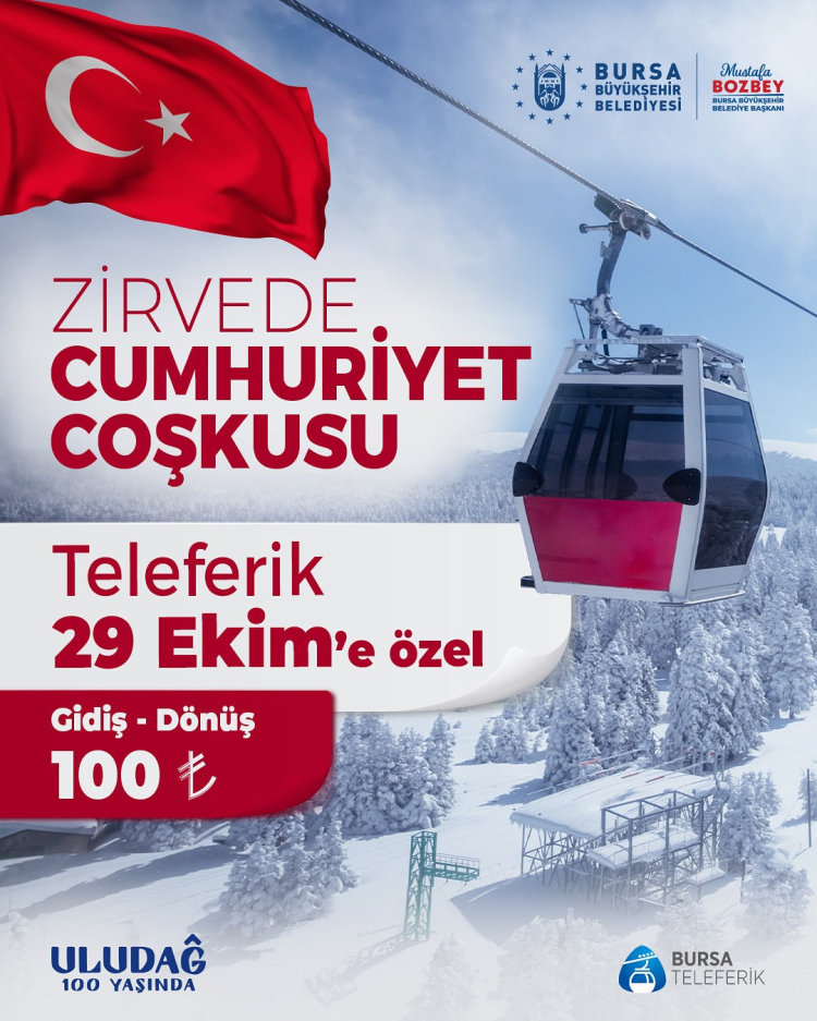 Zirvede Cumhuriyet coşkusu! Cumhuriyetimizin 102. kuruluş yıl dönümünü gururla kutlamaya hazırlanıyor; Bursalı hemşehrilerimizi ve 29 Ekim coşkusunu Bursamızda yaşamak isteyen tüm misafirlerimizi, Uludağ’da doğa ile iç içe bir gün geçirmeye, ardından da Cumhuriyet Yürüyüşümüze bekliyoruz. Unutmayın; 29 Ekim’e özel! Teleferik gidiş-dönüş: 100 TL