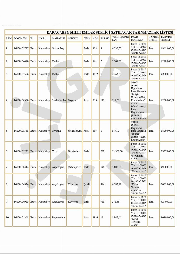Çevre, Şehircilik ve İklim Değişikliği Bakanlığına bağlı Milli Emlak Genel Müdürlüğü, Bursa'nın Karacabey çok sayıda arsa ve tarlayı satma kararı aldı.