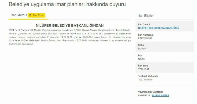 3194 Sayılı Yasanın 18. Madde Uygulamasına tabi onaylanan, 1/1000 Ölçekli Akçalar Uygulama İmar Planı dahilinde, Akçalar Mahallesi H21d20b3d pafta 213 ada 1 parsel ile 8240 ada 1, 2, 3, 4, 5, 6 ve 7 parsellere ait düzenleme haritası, hesap, dağıtım cetvelleri Encümenin 14.02.2024 gün ve 2024/151 sayılı kararı ile onaylanmış olup düzenleme Nilüfer Belediyesi Harita Bürosu İlan Panosunda 15.02.2024 tarihinden itibaren 1 ay süreyle askıya çıkarılmıştır. İlan olunur.