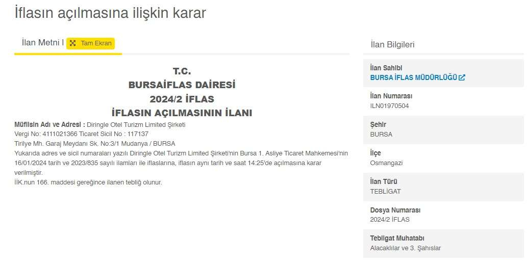 davacı Bursa Ticaret Sicilinin 117137 sicil numarasında kayıtlı Diringle Otel Turizm Limited Şirketi (4111021366 Vergi No ),(0411102136600001 Mersis No)'nin borca batık olduğu anlaşıldığından 16/01/2024 tarih ve saat 14:25 itibariyle iflasına, iflasın gecikmeksizin Bursa İflas Müdürlüğüne bildirilmesine, Konkordato Komiseri Nesrin Beşe'nin görevinin sonlandırılmasına karar verilmiştir. Kararın İİK 288.Maddesi uyarınca ilan olunur." ifadeleri kullanıldı.