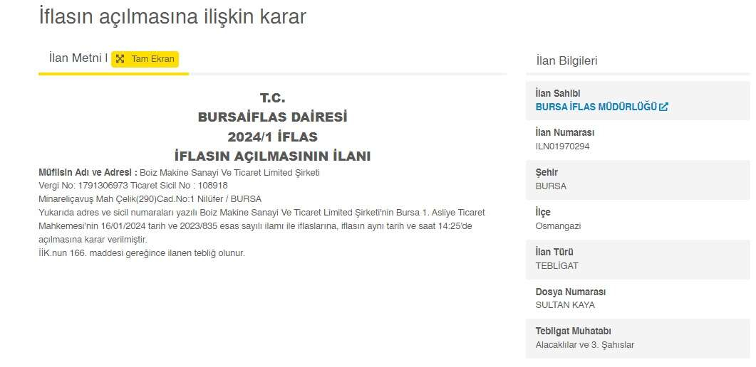Yukarıda adres ve sicil numaraları yazılı Boiz Makine Sanayi Ve Ticaret Limited Şirketi'nin Bursa 1. Asliye Ticaret Mahkemesi'nin 16/01/2024 tarih ve 2023/835 esas sayılı ilamı ile iflaslarına, iflasın aynı tarih ve saat 14:25'de açılmasına karar verilmiştir.