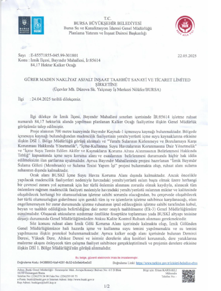 BUSKİ, söz konusu ruhsat alanının İznik Gölü Koruma Alanı içerisinde kalmakta olduğunu, ocak alanı içerisinde bulunan Demirci Deresi, Yüksek Dere, Altıkoz Deresi ve isimsiz derelerin akış kesitlerinin korunması gerektiğini bildirdi.