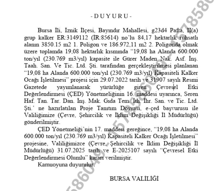 Çevre, Şehircilik ve İklim Değişikliği Müdürlüğü tarafından yapılan açıklamada, "Bursa ili, İznik İlçesi, Bayındır Mahallesi, g23d4 Pafta, II(a) grup kalker ER:3149112 (İR:85614) no’lu 84,17 hektarlık ruhsatlı alanın 3850.15 m2 1. Poligon ve 186.972,11 m2 2. Poligonda olmak üzere toplamda 19,08 hektarlık kısmında “19,08 ha Alanda 600.000 ton/yıl (230.769 m3/yıl) kapasite ile Gürer Maden Nak. Asf. İnş. Taah. San. Ve Tic. Ltd. Şti. tarafından gerçekleştirilmesi planlanan “19,08 ha Alanda 600.000 ton/yıl (230.769 m3/yıl) Kapasiteli Kalker Ocağı İşletilmesi” projesi için 29.07.2022 tarih ve 31907 sayılı Resmi Gazetede yayımlanarak yürürlüğe giren Çevresel Etki Değerlendirmesi (ÇED) Yönetmeliğinin 16. maddesi uyarınca, Seren Haf. Tan. Tar. Dan. İnş. Mak. Gıda Tem. İth. İhr. San. ve Tic. Ltd. Şti.’ ne hazırlatılan Proje Tanıtım Dosyası, e-çed başvurusu ile Valiliğimize (Çevre, Şehircilik ve İklim Değişikliği İl Müdürlüğü) gönderilmiştir. ÇED Yönetmeliği’nin 17. maddesi gereğince, “19,08 ha Alanda 600.000 ton/yıl (230.769 m3/yıl) Kapasiteli Kalker Ocağı İşletilmesi” projesine, Valiliğimizce (Çevre, Şehircilik ve İklim Değişikliği İl Müdürlüğü) 31.07.2025 tarih ve E-2025107 sayılı “Çevresel Etki Değerlendirmesi Olumlu” kararı verilmiştir. Kamuoyuna duyurulur. " ifadelerine yer verildi.