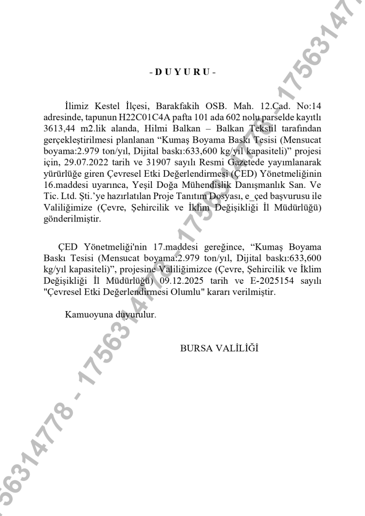 Yapılan açıklamada, "ÇED Yönetmeliği'nin 17.maddesi gereğince, “Kumaş Boyama Baskı Tesisi (Mensucat boyama:2.979 ton/yıl, Dijital baskı:633,600 kg/yıl kapasiteli)”, projesine Valiliğimizce (Çevre, Şehircilik ve İklim Değişikliği İl Müdürlüğü) 09.12.2025 tarih ve E-2025154 sayılı "Çevresel Etki Değerlendirmesi Olumlu" kararı verilmiştir." ifadelerine yer verildi.