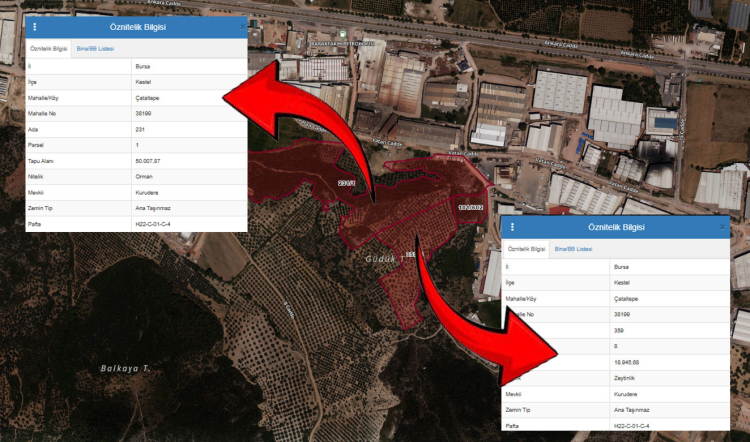 Ancak Tapu ve Kadastro Genel Müdürlüğü (TKGM) Parsel Sorgulama Uygulamasınından sorgulama yapıldığında 231 ada 1 nolu parselin orman, 359 ada 8 nolu parselin ise zeytinlik niteliği taşıdığı görülüyor.