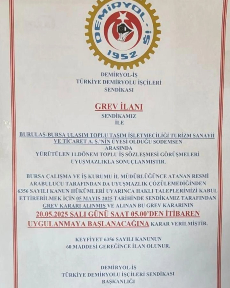 BURULAŞ’ta (Bursa Ulaşım Toplu Taşıma İşletmeciliği) yetkili Türkiye Demiryolu İşçileri Sendikası (Demiryol İş), işveren sendikası SODEMSEN’le 2 bin 800 çalışanı kapsayan 11. Dönem Toplu İş Sözleşmesi (TİS) görüşmelerinin yasal sürede anlaşma sağlanmadan kapanması üzerine greve gitme kararı almıştı.