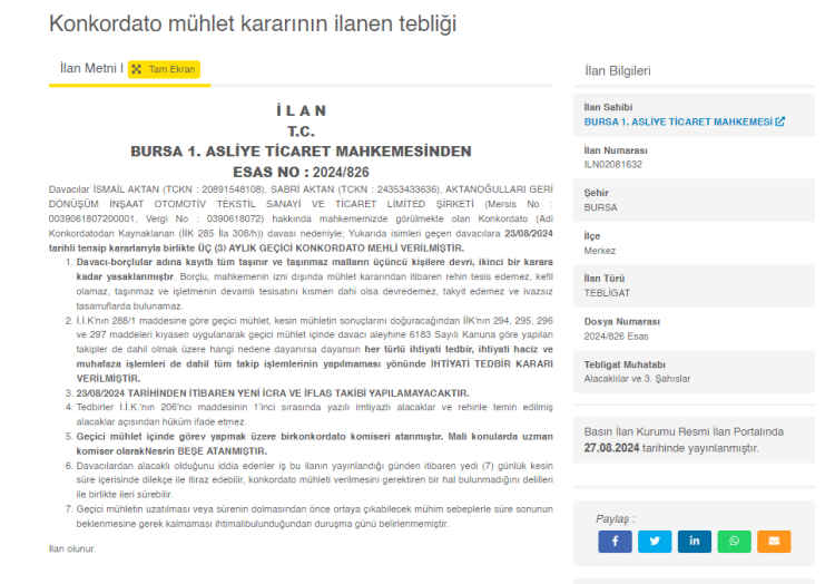 Bursa'da faaliyet gösteren Aktanoğulları Geri Dönüşüm İnşaat Otomotiv Tekstil Sanayi Ve Ticaret Limited Şirketi konkordato ilan etti.