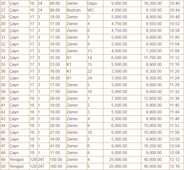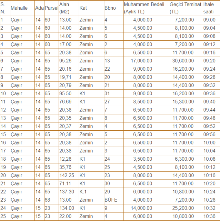 Taşınmazlar için belirlenen aylık kira bedelleri (muhammen) 1.500 TL ile 25 bin TL arasında değişiyor.