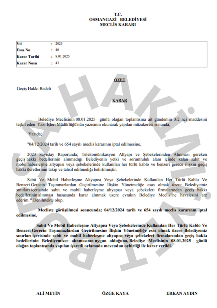 Osmangazi Belediyesi Meclisi, 2025 yılının ilk meclis toplantısında telekomünikasyon altyapı ve şebekelerinden geçiş hakkı bedellerinin alınması için karar aldı.