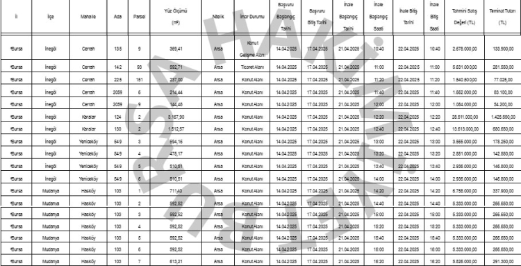 İhale kapsamında İnegöl'de 11, Mudanya'da 7 arsa satılacağı bildirildi.