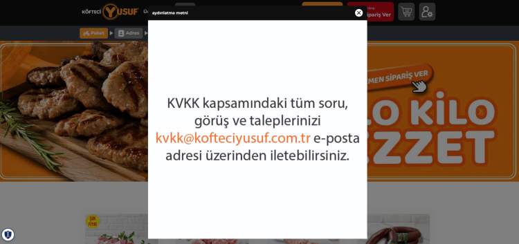 Açılan sitede, "KVKK kapsamındaki tüm soru, görüş ve taleplerinizi kvkk@kofteciyusuf.com.tr e-posta adresi üzerinden iletebilirsiniz." ifadelerinin yer aldığı aydınlatma metnine yer verildi.