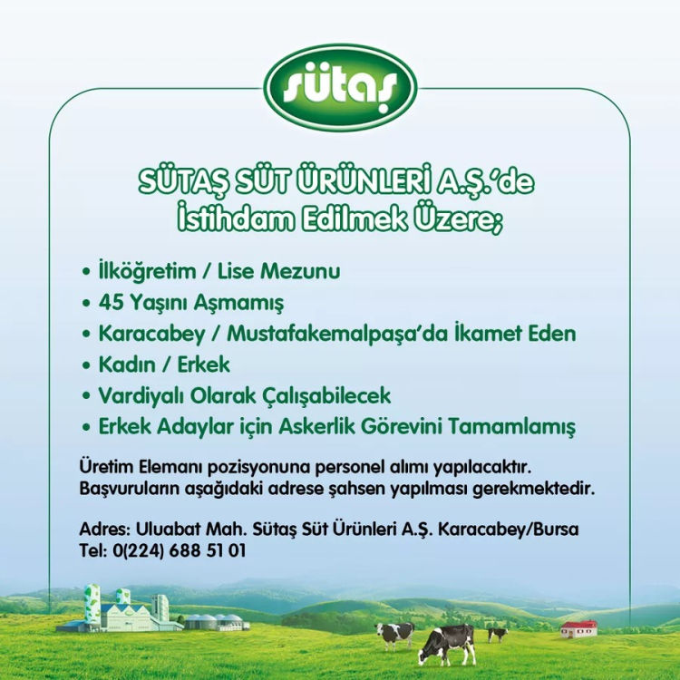 Başvuru adresi: Uluabat Mahallesi, Sütaş Süt Ürünleri A.Ş. Karacabey / Bursa
